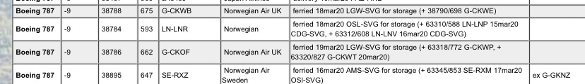 Cinque B787-9 Norwegian UK, 3 della Norwegian e 2 di Norwegian Air Sweden da vari aeroporti nei giorni scorsi sono stati spostati a Stavanger in Norvegia. Le provenienze sono le più varie dalla vicina Oslo, quindi Amsterdam, Londra Gatwick oppure Parigi CDG.