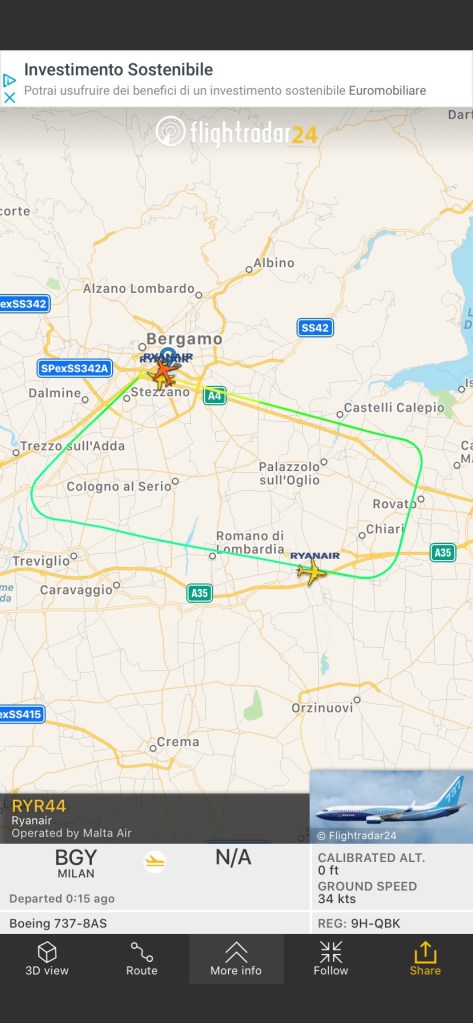 Tre B737/8AS 9H-QBK/R/AZ stanno effettuando stamani giri campo a Bergamo. I velivoli di Malta Air/Ryanair vengono mantenuti efficienti con questi cortissimi voli che si limitano ad un decollo, circuito in base ed atterraggio. In totale una quindicina di minuti di volo ciascuno ad una quota massima di FL080.
