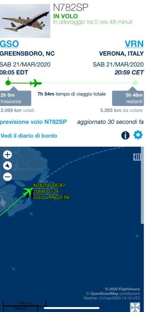 Fra quasi sei ore sarà a Verona il DC8/72CF N782SP Samaritan Purse. E’ il secondo volo in pochi giorni. L’aereo era ritornato a Greensboro in North Carolina ed un paio di ore fa e’ ripartito per una nuova missione di solidarietà verso il nostro paese con un carico di aiuti.