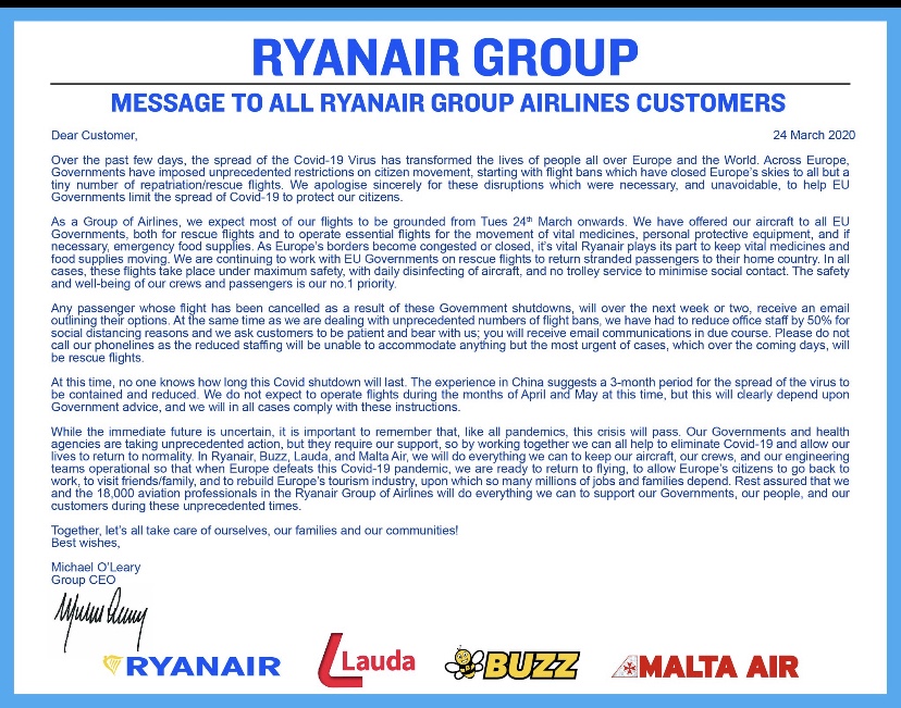 Oltre alle frasi di rito, Michael O’Leary ha comunicato di aver offerto i propri aerei ai Governi europei per il trasporto di materiali di prima necessità’. O’Leary quindi ha tentato la carta dei voli cargo come riempitivo del business ora mancante alle sue aziende.