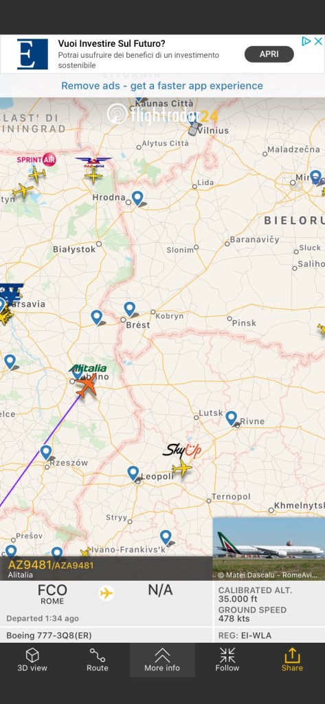 A breve entrerà nello spazio aereo bielorusso il Boeing 777/300ER EI-WLA e’ come AZA9481 da Roma Fiumicino a Shanghai. L’aereo e’ decollato da poco più di due ore ed arriverà fra una decina in Cina. Il volo operato con questo grande aereo passeggeri permetterà di trasportare aiuti medicali in Patria riempiendo ogni dove e’ possibile in sicurezza.