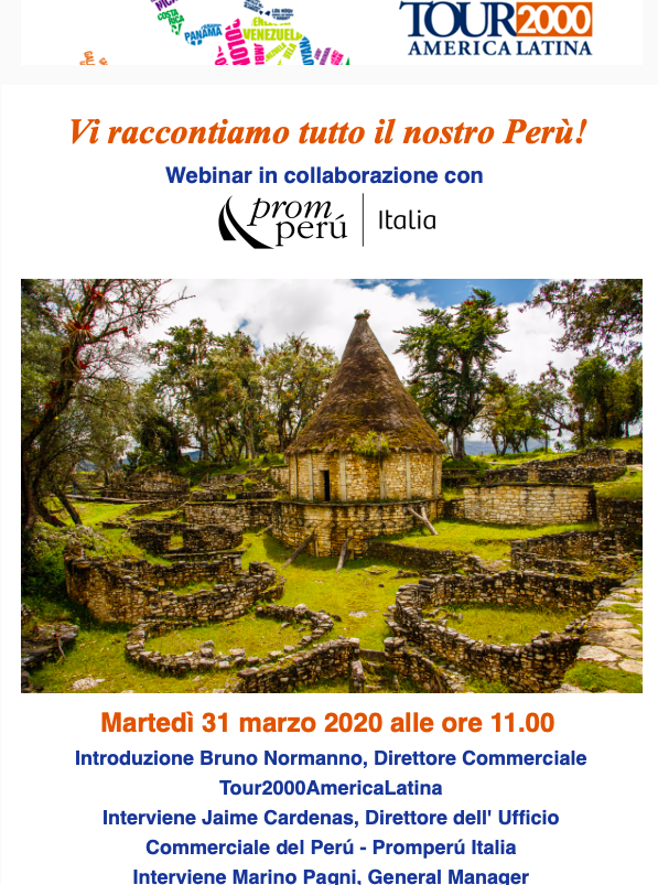 Tour2000AmericaLatina, tour operator specializzato da oltre 25 anni, nell’organizzazione di viaggi in Perù ha organizzato con Promperù, un webinar di formazione sulla destinazione aperto a tutte le Agenzie di Viaggio presenti in Italia.