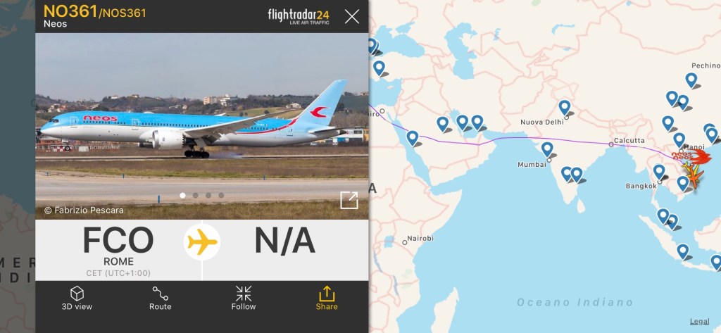 compagnie aeree, rotte, Senza categoria Neos : i voli verso le Filippine Pubblicato da Italiavola il 28 marzo 2020 Si stanno concludendo i voli verso le Filippine per i due B787-9 Neos partiti ieri sera da Roma e Milano. Entrambi appaiati a breve distanza, sono sul Vietnam centrale. Poi il braccio di mare fino a Manila NAIA. Condividi: Fai clic per condividere su Facebook (Si apre in una nuova finestra) Facebook Fai clic qui per condividere su LinkedIn (Si apre in una nuova finestra) LinkedIn Fai clic qui per condividere su Reddit (Si apre in una nuova finestra) Reddit Fai clic qui per condividere su Pinterest (Si apre in una nuova finestra) Pinterest Fai clic qui per condividere su Tumblr (Si apre in una nuova finestra) Tumblr Fai clic per condividere su X (Si apre in una nuova finestra) X Mi piace Caricamento... Correlati