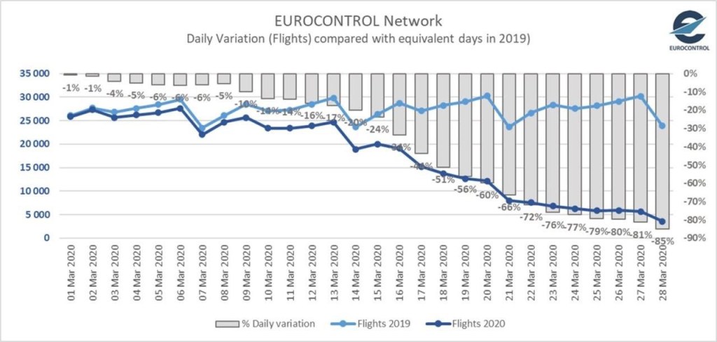 Continua la parabola in discesa per il numero dei voli registrati in Europa nella giornata di ieri. Nel grafico che mostra la corsa al ribasso dal 1 marzo. Ovviamente i decrementi dei singoli giorni fanno riferimento al metodo di comparazione anno su anno.