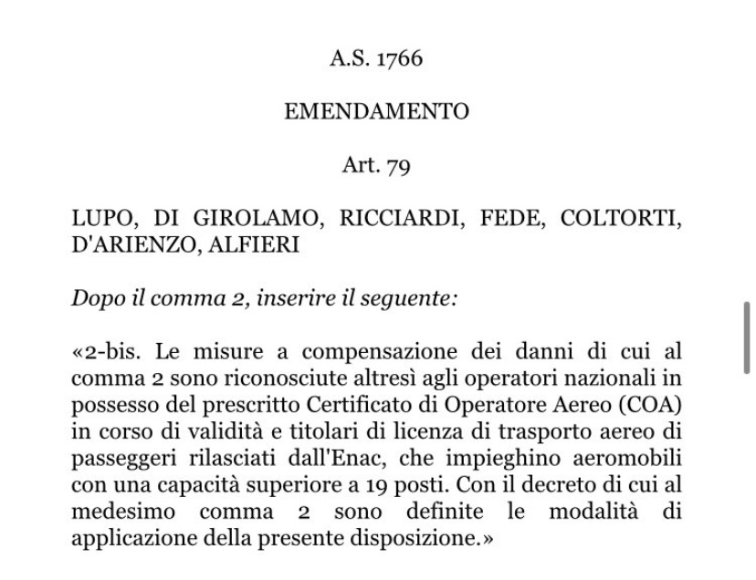 Un emendamento. e’ stato presentato da un gruppo di parlamentari al fine di estendere i benefici, anche a tutti gli operatori italiani detentori di certificato di operatore aereo per velivoli che eccedono i 19 posti. Nell’immagine il suo testo.