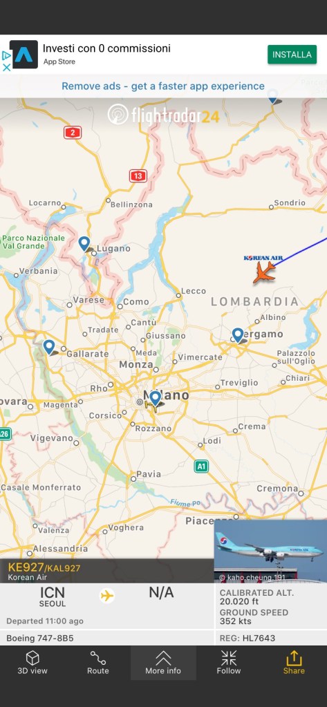 compagnie aeree, rotte, Senza categoria Korean Air per la prima volta a Milano Malpensa con B747-8i Pubblicato da Italiavola il 30 marzo 2020 La prima volta per il Boeing 747-8i Korean Air a Milano Malpensa sarà a breve. All’aereo manca poco più di una decina di minuti per atterrare. Il volo e’ organizzato per trasferire coreani in patria. Condividi: Fai clic per condividere su Facebook (Si apre in una nuova finestra) Facebook Fai clic qui per condividere su LinkedIn (Si apre in una nuova finestra) LinkedIn Fai clic qui per condividere su Reddit (Si apre in una nuova finestra) Reddit Fai clic qui per condividere su Pinterest (Si apre in una nuova finestra) Pinterest Fai clic qui per condividere su Tumblr (Si apre in una nuova finestra) Tumblr Fai clic per condividere su X (Si apre in una nuova finestra) X Mi piace Caricamento... Correlati