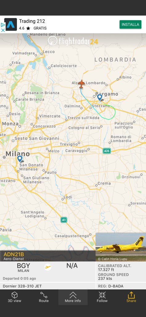 aeroporti, compagnie aeree, Senza categoria Parte il volo ADAC da Bergamo Pubblicato da Italiavola il 31 marzo 2020 E’ decollato da Bergamo il Dornier 328JET ADAC. Le marche sono D-BADA. E’ un aereo ambulanza. Condividi: Fai clic per condividere su Facebook (Si apre in una nuova finestra) Facebook Fai clic qui per condividere su LinkedIn (Si apre in una nuova finestra) LinkedIn Fai clic qui per condividere su Reddit (Si apre in una nuova finestra) Reddit Fai clic qui per condividere su Pinterest (Si apre in una nuova finestra) Pinterest Fai clic qui per condividere su Tumblr (Si apre in una nuova finestra) Tumblr Fai clic per condividere su X (Si apre in una nuova finestra) X Mi piace Caricamento... Correlati