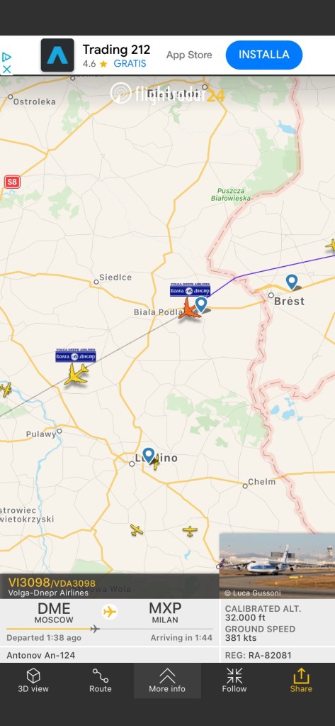 Due Antonov 124 in fila indiana, entrambi appena entrati nello spazio aereo polacco. I due aerei sono della compagnia russa specializzata in voli over size Volga Dnepr Airlines. Tutti e due decollati da Shanghai via Krasnoyarsk. Il primo ha destinazione Bologna ed il secondo Milano Malpensa. L’arrivo per tutti e due attorno alle 14.