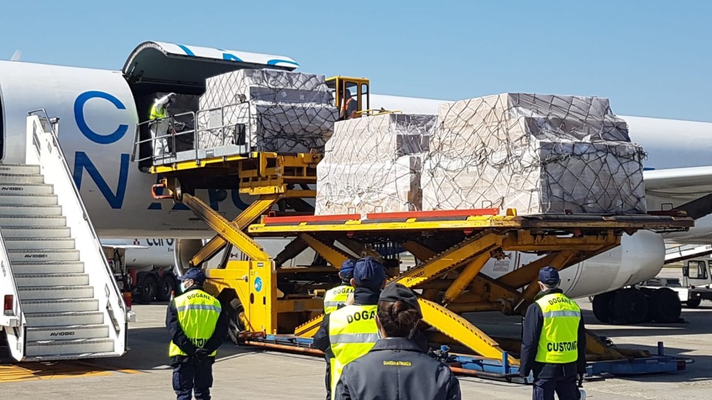 Il totale del carico si aggira sulle 15 tonnellate. C’è’ molto volume, ma il loro peso e’ relativamente basso. Il volo e’ stato curato nello scarico da Fast Freight Marconi e Aeroporto di Bologna supervisionato dalla Agenzia delle Dogane per quanto concerne la parte di verifica sulla conformità di importazione di beni e documenti.