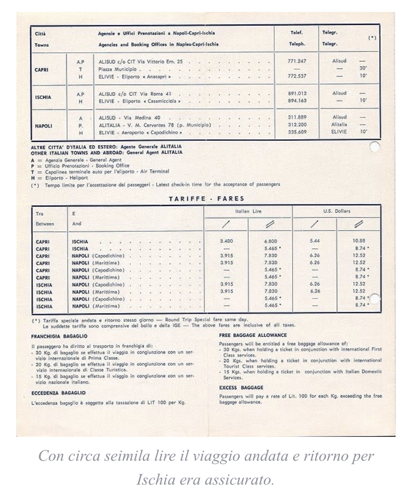 I servizi aerei con il boom economico ebbero sempre più successo. Più passeggeri chiedevano di volare, anziché prendere la nave. I costi: circa 6000 mila lire per un andata e ritorno che nel 1967 era 1/4 di uno stipendio mensile medio. Ma spesso i passeggeri non erano pendolari, bensì i turisti che dagli USA o da altre nazioni usavano l’elicottero per recarsi nelle località famosissime della Costiera o delle isole.