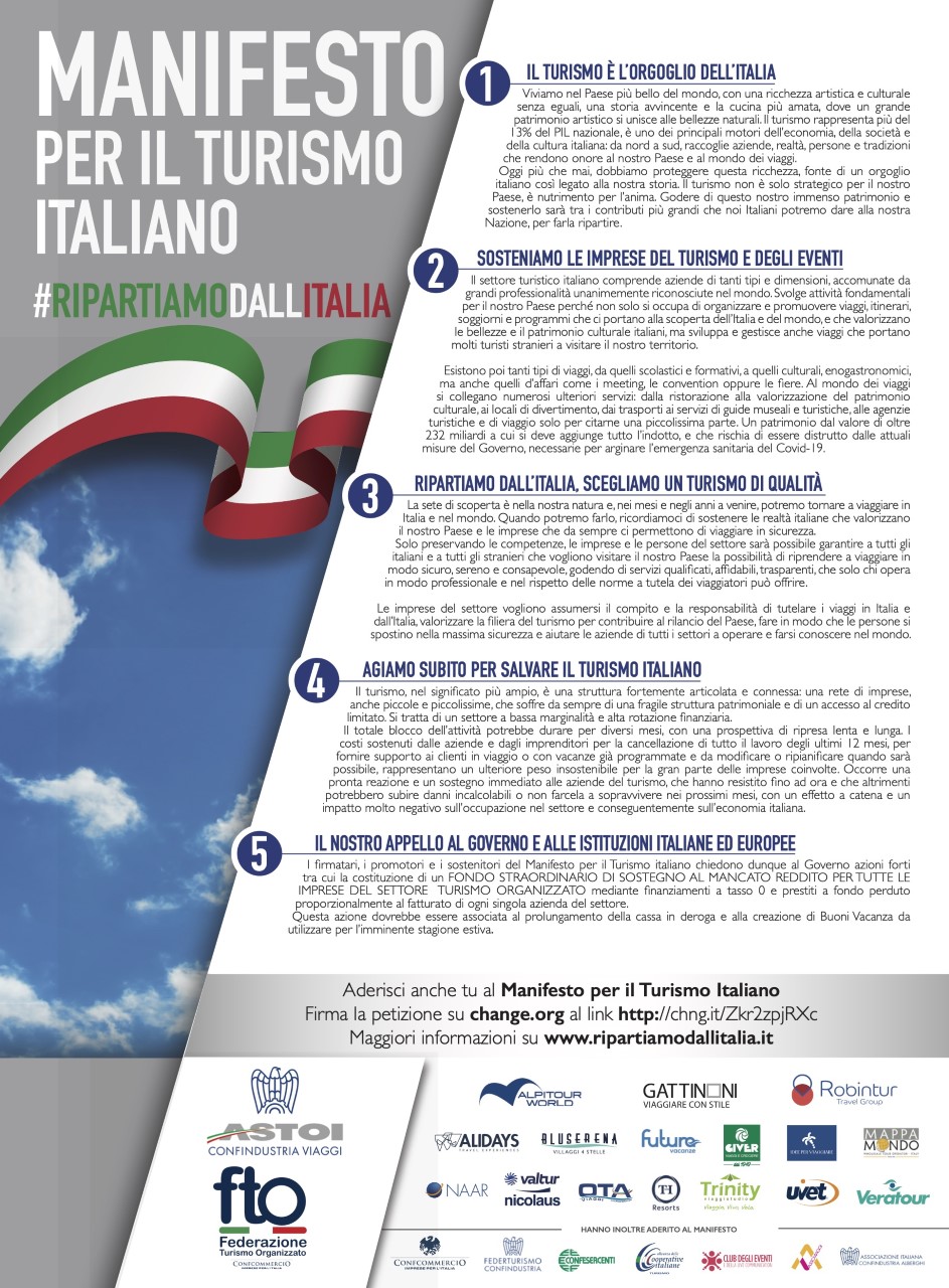Per la prima volta aziende private, in qualche modo concorrenti, si uniscono per lanciare un grido di allarme su uno dei settori più colpiti da questa crisi e diventano i promotori del Manifesto per il Turismo Italiano, con l’hashtag #ripartiamodallitalia. Un’iniziativa che chiama a raccolta le istituzioni, tutti coloro che vivono di turismo e quanti, anche da semplici cittadini e viaggiatori, vogliono esprimere il proprio sostegno e far ripartire nel prossimo futuro quello che è, nel suo insieme, un settore economico fondamentale per il Paese e uno dei suoi elementi di orgoglio e identità più forti.