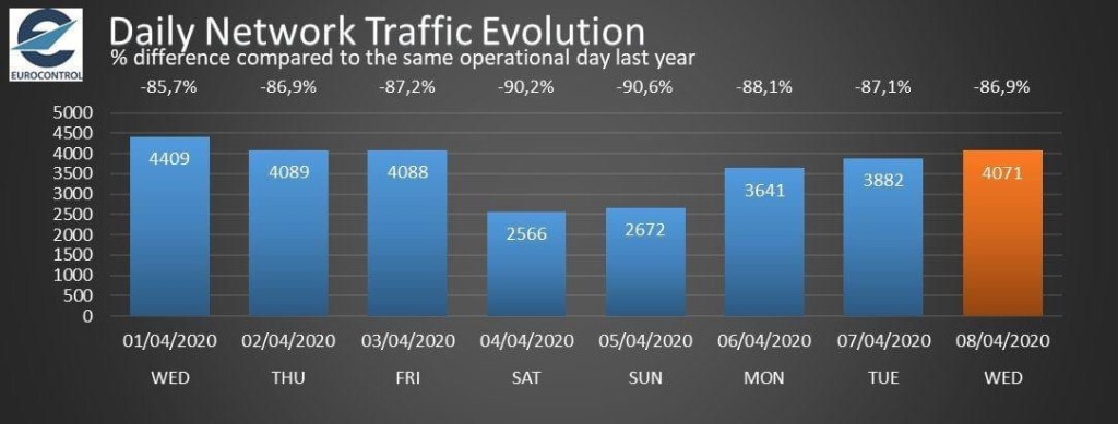 Il traffico e’ in leggera ripresa di poche unità rispetto al picco più basso di sabato, domenica e lunedì scorso. Questo è’ l’andamento negli ultimi otto giorni. Ieri si è’ ritornati sopra quota 4000. Comunque sempre oltre il -85% rispetto ad un anno fa. Molti voli cargo e governativi che fanno la spola per l’emergenza del covid-19.