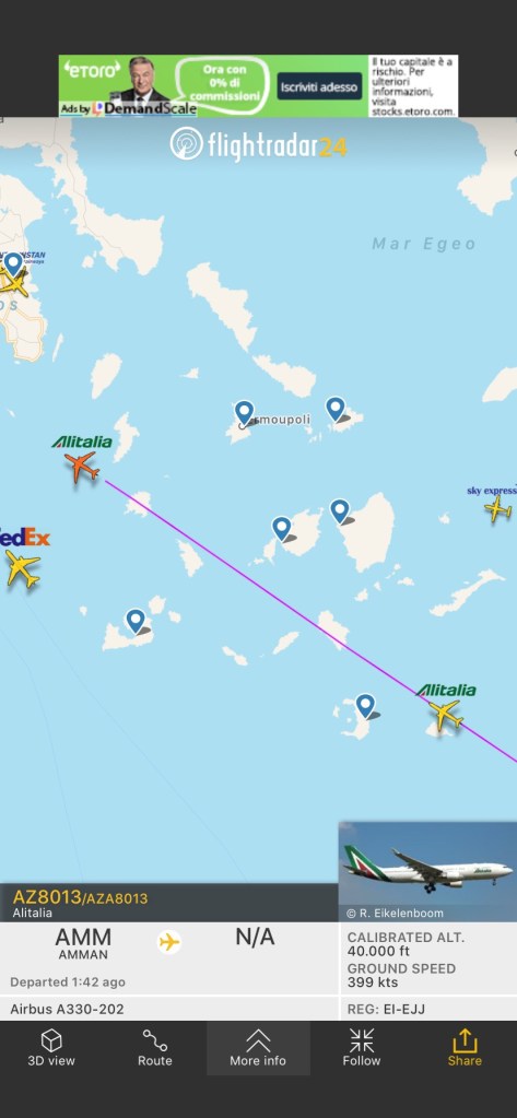 In fila indiana sul Mar Egeo vediamo due A330/202 Alitalia! Il primo e’ l’AZ8013 operato da EI-EJJ di ritorno da Jaramco ad Amman dopo un check pesante di manutenzione. Quindi un A330/202 EI-EJO impegnato in un volo di rimpatrio da Amman per Roma Fiumicino. Il volo di andata di questo velivolo, e’ servito a trasportare l’equipaggio impegnato poi per prelevare l’aereo, che ha finito il check di manutenzione. Oggi, con le limitazioni di viaggio imposte oltre alla inesistenza di collegamenti aerei risulta difficoltoso raggiungere destinazioni anche non proprio lontane.