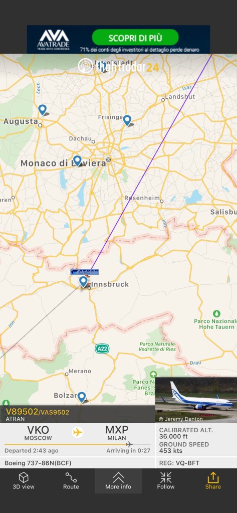 compagnie aeree, rotte, Senza categoria Atran Air arriva a Milano Malpensa con B737/800SF Pubblicato da Italiavola il 14 aprile 2020 Un B737/86N BCF VQ-BFT VAS9502 e’ in arrivo a Milano Malpensa proveniente da Nanjing via Krasnoyarsk e Mosca Vnukovo. A bordo 13 tonnellate di dispositivi protettivi individuali per l’emergenza Covid-19. Condividi: Fai clic per condividere su Facebook (Si apre in una nuova finestra) Facebook Fai clic qui per condividere su LinkedIn (Si apre in una nuova finestra) LinkedIn Fai clic qui per condividere su Reddit (Si apre in una nuova finestra) Reddit Fai clic qui per condividere su Pinterest (Si apre in una nuova finestra) Pinterest Fai clic qui per condividere su Tumblr (Si apre in una nuova finestra) Tumblr Fai clic per condividere su X (Si apre in una nuova finestra) X Mi piace Caricamento... Correlati