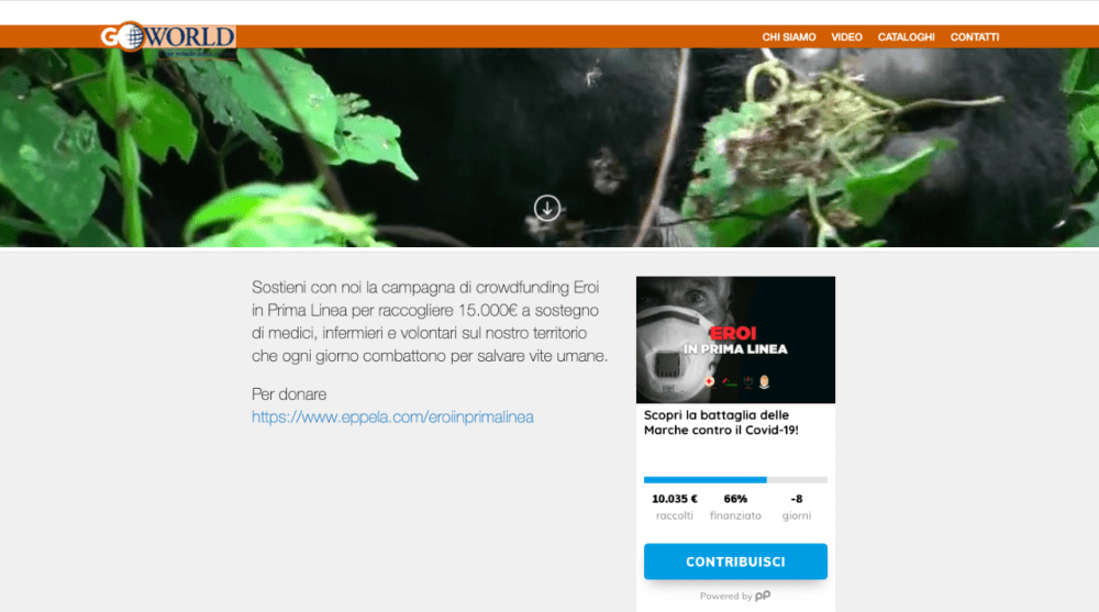 Go World, gruppo di tour operator specializzato in viaggi su misura in tutto il mondo con Go Asia, Go America, Go Afrique e Go Australia con sede ad Ancona, sostiene il crowdfunding “Eroi in Prima Linea” organizzato da 49 studenti del Corso Universitario “Business Angels & Crowdfunding” dell’Università di Camerino e guidato dal Professore Filippo Cossetti.