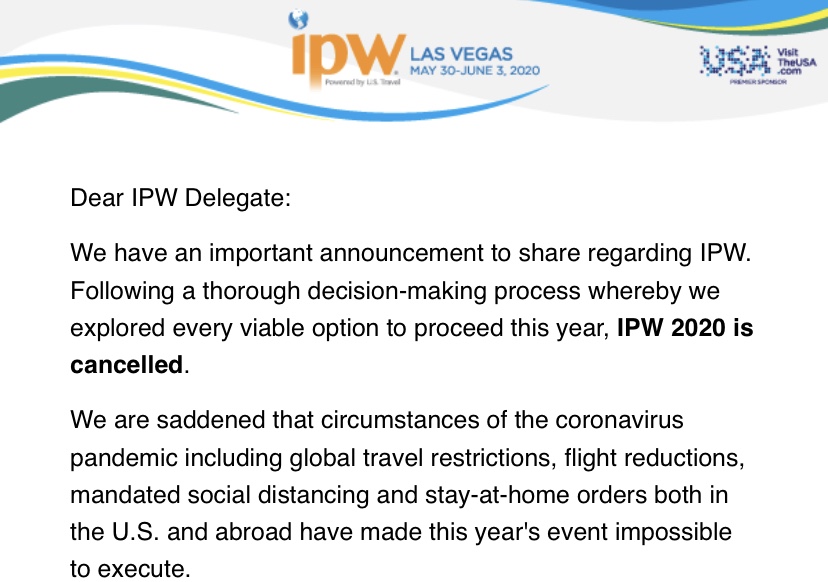 Mai e’ accaduto che l’IPW fosse stato cancellato. La kermesse americana meglio conosciuta con Pow Wow e’ sempre stata per 52 anni l’evento clou della proposta turistica USA al mondo.