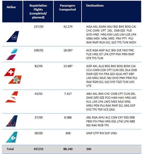 La rapida diffusione della pandemia del Coronavirus e le restrizioni di viaggio impo-ste in tutto il mondo hanno innescato il ritorno di un numero senza precedenti di turisti e viaggiatori a partire dalla metà di marzo. Dopo poco più di un mese, i pro-grammi di rimpatrio di vari governi europei e di numerosi sostenitori del turismo sono stati quasi del tutto completati. Tutte le compagnie aeree del Gruppo Lufthansa hanno contribuito a sostenere i rispettivi governi fornendo un importante numero di voli di rimpatrio.
