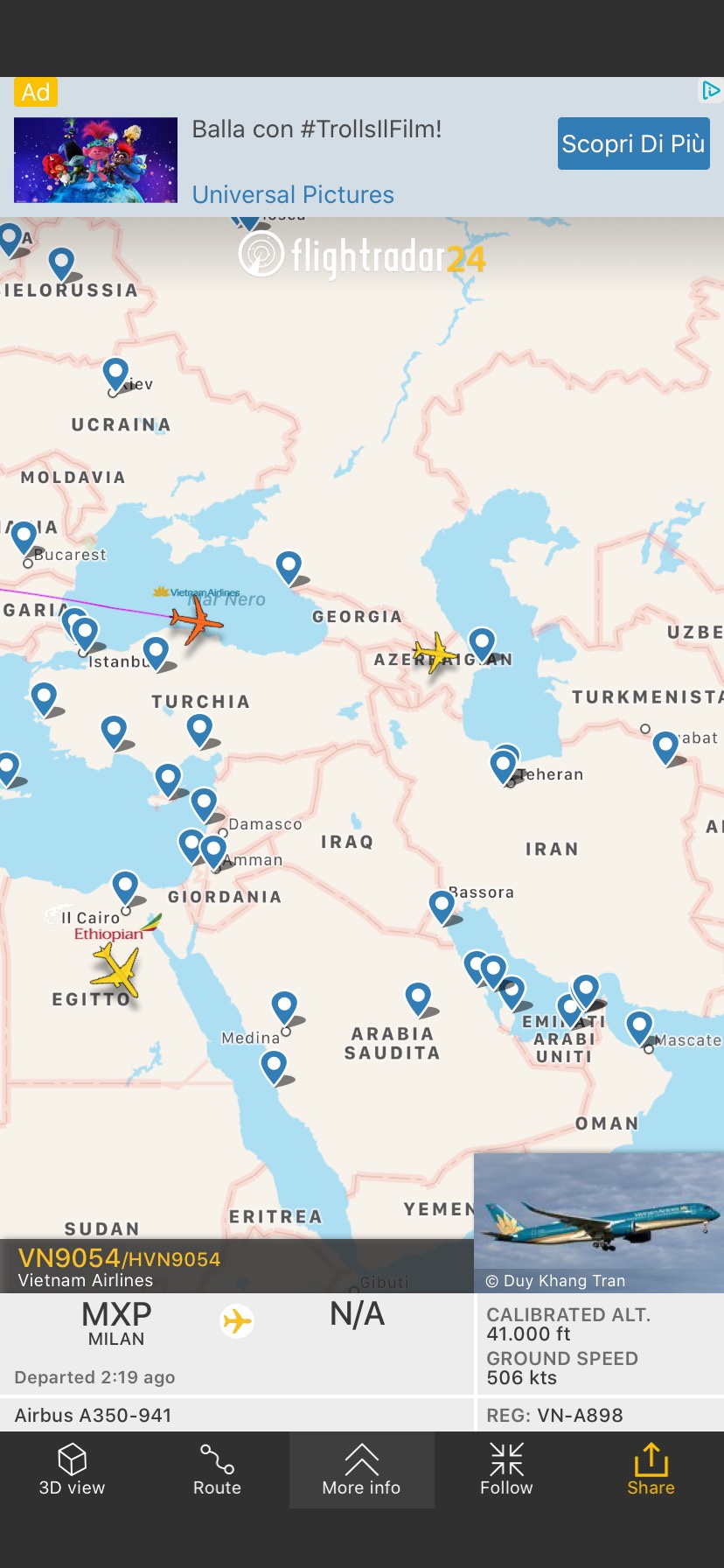 Ecco altri due aerei cargo, un B777-F60 partito da Milano Malpensa per Addis Ababa dove ha scaricato altro materiale medicale. Come pure l’A350/900 Vietnam Airlines comparso questa prima mattina sull’aeroporto milanese proveniente da Hanoi.