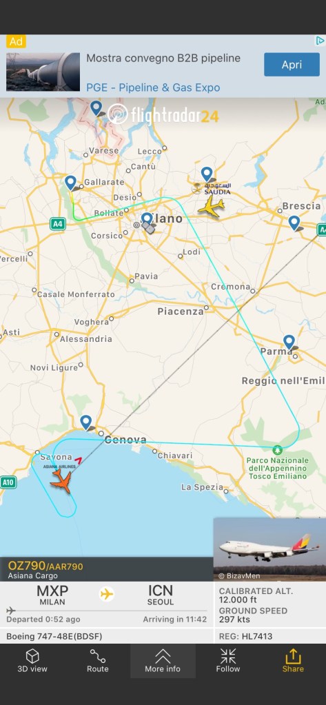 Questo volo Asiana Cargo AAR/OZ790 da Milano Malpensa per Seoul e’ decollato regolarmente poi ha virato a destra verso sud fino al Lupos e poi verso il Mar Ligure ed ora a FL120 sta facendo delle orbite o biscotti molto lunghi.
