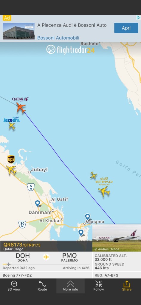 compagnie aeree, rotte Qatar Cargo arriva oggi a Palermo Pubblicato da Italiavola il 19 aprile 2020 Poco dopo le 15 a Palermo arriverà il volo QR8173 da Doha della Qatar Cargo con B777-FDZ A7-BFG. L’aereo avrà a bordo presumibilmente aiuti medicali. Condividi: Fai clic per condividere su Facebook (Si apre in una nuova finestra) Facebook Fai clic qui per condividere su LinkedIn (Si apre in una nuova finestra) LinkedIn Fai clic qui per condividere su Reddit (Si apre in una nuova finestra) Reddit Fai clic qui per condividere su Pinterest (Si apre in una nuova finestra) Pinterest Fai clic qui per condividere su Tumblr (Si apre in una nuova finestra) Tumblr Fai clic per condividere su X (Si apre in una nuova finestra) X Mi piace Caricamento... Correlati