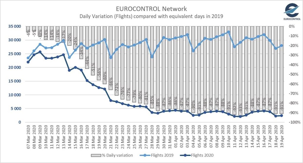 Diverse comparazioni da Eurocontrol. La prima immagine riguarda il numero dei voli gestiti tra l’altro ieri ed un anno prima.