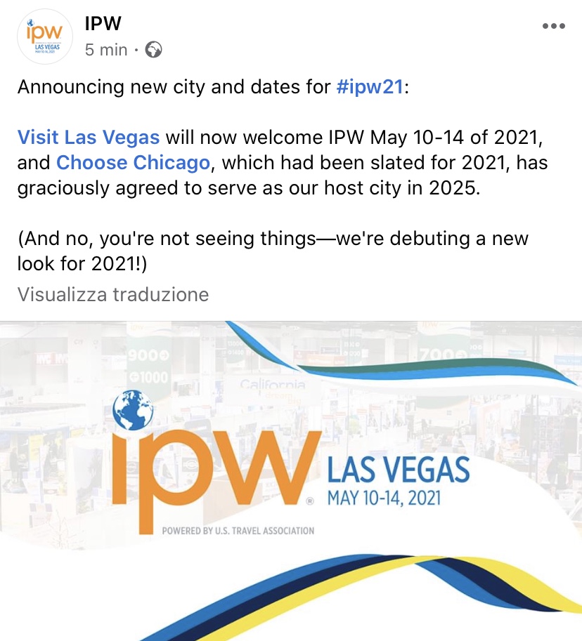 Cinque minuti fa l’annuncio, che Las Vegas ospiterà l’edizione 2021 dell’International Pow Wow. La kermesse turistica che riunisce tutta l’offerta USA a stelle e strisce promossa da #USTA e #BrandUSA verrà riproposta a Las Vegas, perché quest’anno la prevista edizione dal 30 maggio al 3 giugno e’ stata cancellata per l’emergenza Covid-19, che sta colpendo il mondo intero. L’edizione 2021 era prevista da svolgersi a Chicago.