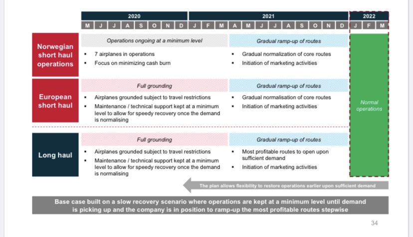 Nella presentazione inviata qualche giorno fa per l’incontro con i bond holders, la Norwegian ha chiaramente riportato nel diagramma di Gantt , che ritornerà a volare sul medio raggio europeo e sul lungo raggio dalla primavera 2021.