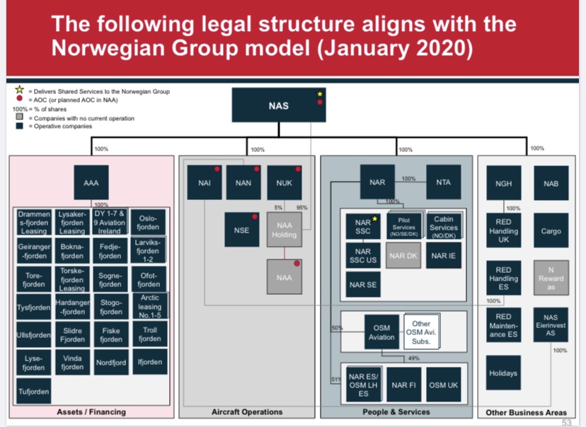 Recentemente quattro società della holding. che avevano in capo una buona parte degli equipaggi hanno dichiarato bancarotta. Esse supportavano Norwegian, fornendogli I piloti e assistenti di volo come fossero fornitrici di servizi in outsourcing. Però’ operanti all’interno del perimetro globale della galassia Norwegian.