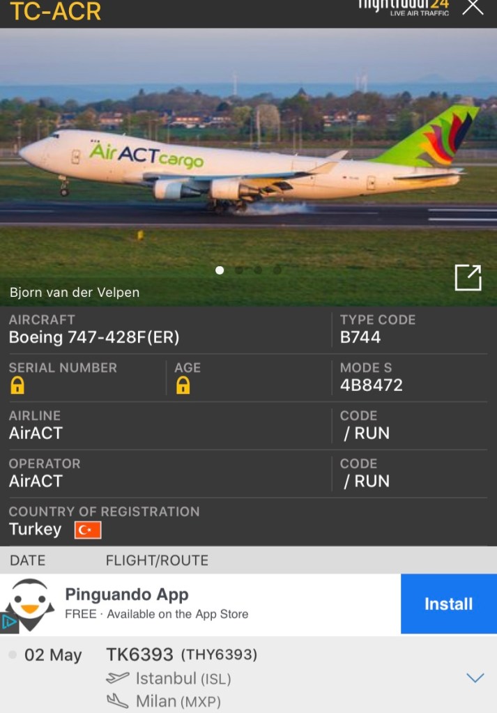 compagnie aeree, rotte Turkish Airlines con aereo Air ACT Cargo B747/428F Pubblicato da Italiavola il 2 Maggio 2020 Questo pomeriggio il volo TK6393 da Istanbul ISL e’ giunto a Milano Malpensa con il Boeing 747/428F TC-ACR della Air ACT Cargo in ACMI. Condividi: Fai clic per condividere su Facebook (Si apre in una nuova finestra) Facebook Fai clic qui per condividere su LinkedIn (Si apre in una nuova finestra) LinkedIn Fai clic qui per condividere su Reddit (Si apre in una nuova finestra) Reddit Fai clic qui per condividere su Pinterest (Si apre in una nuova finestra) Pinterest Fai clic qui per condividere su Tumblr (Si apre in una nuova finestra) Tumblr Fai clic per condividere su X (Si apre in una nuova finestra) X Mi piace Caricamento... Correlati