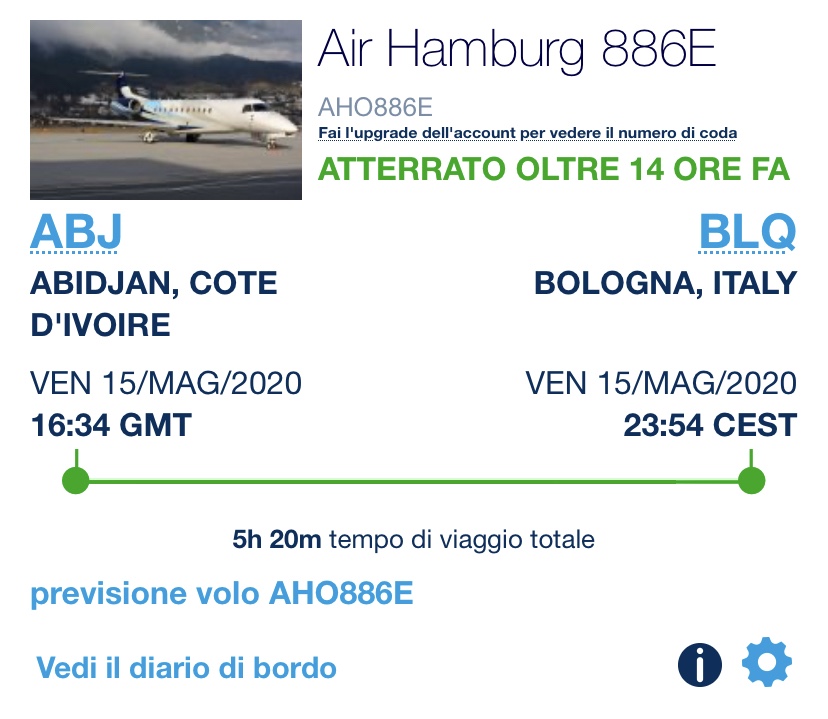 compagnie aeree, rotte Air Hamburg da Abidjan a Bologna Pubblicato da Italiavola il 17 Maggio 2020 L’altra sera un EMB135 corporate della Air Hamburg e’ giunto a Bologna insolitamente da Abidjan in Costa d’Avorio. Poi ha proseguito per Colonia. Condividi: Fai clic per condividere su Facebook (Si apre in una nuova finestra) Facebook Fai clic qui per condividere su LinkedIn (Si apre in una nuova finestra) LinkedIn Fai clic qui per condividere su Reddit (Si apre in una nuova finestra) Reddit Fai clic qui per condividere su Pinterest (Si apre in una nuova finestra) Pinterest Fai clic qui per condividere su Tumblr (Si apre in una nuova finestra) Tumblr Fai clic per condividere su X (Si apre in una nuova finestra) X Mi piace Caricamento... Correlati
