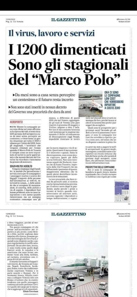 Segnala la problematica di 1200 lavoratori stagionali dell’aeroporto Marco Polo di Venezia. Tutti non beneficerebbero di alcun ammortizzatore sociale per lo stato di temporaneità e precarietà del loro tipo di rapporto di lavoro in essere.