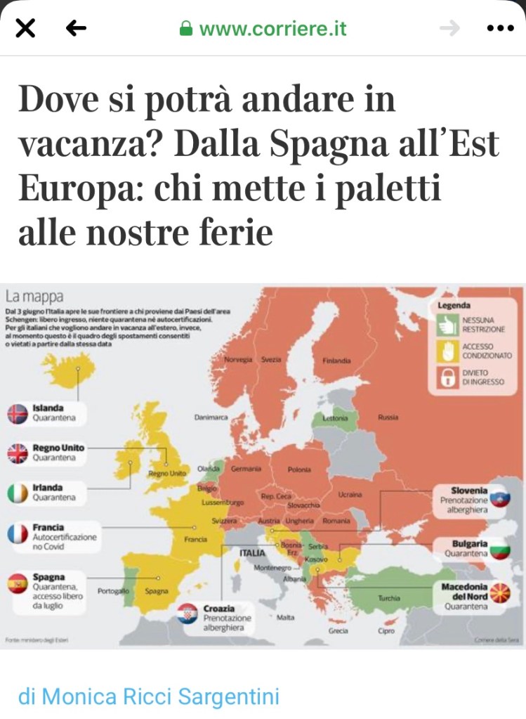In questo articolo di Monica Ricci Sargentini c’è’ una chiara mappa su dove si può andare all’estero dopo il 3 giugno.