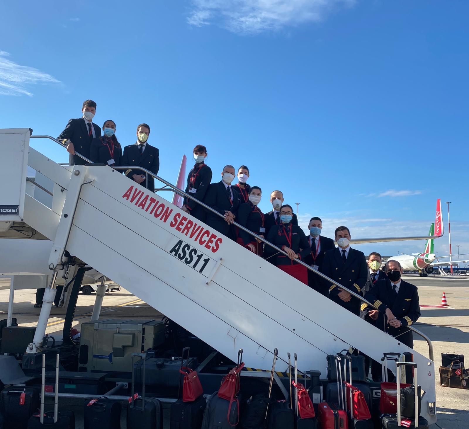 Nella foto sopra l’aereo sul mar Tirreno e sotto l’equipaggio ripreso prima della partenza da Roma Fiumicino.