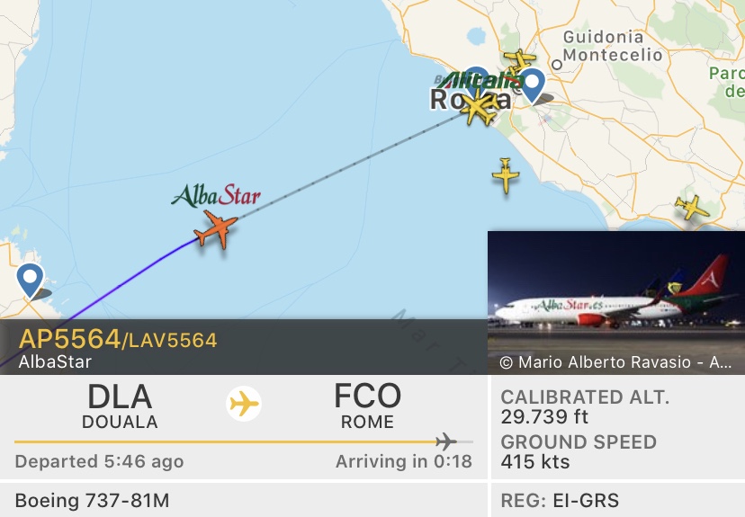 Entro venti minuti il Boeing 737/81M EI-GRS della AlbaStar sarà con le ruote a terra al Leonardo Da Vinci di Roma Fiumicino.