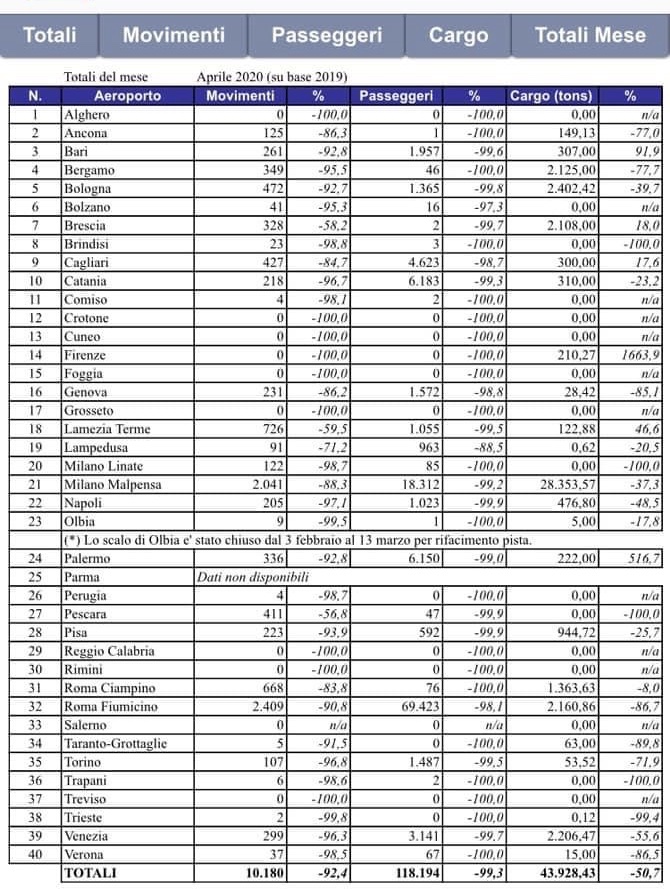 Quelli del mese di aprile 2020, per gli aeroporti Italiani sono stati dati terribili. Infatti, rispetto all’anno precedente, il differenziale e’ stato del 99,3% in meno. Il numero di passeggeri e’ stato di 118.194 passeggeri. I volumi praticamente azzerati.