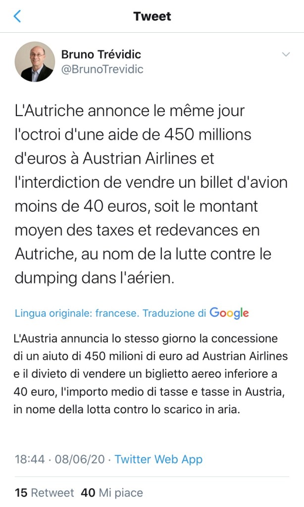 Questo giornalista in Francia, Bruno Trevidic, molto stimato, di Les Echos Transport, fa notare che oltre agli aiuti da 450 milioni di € per Austrian Airlines. Tra le pieghe spunta un divieto di fare dumping vendendo biglietti aerei sotto i 40€ a tratta. Ognuno “mena il can per l’aia” a proprio piacimento.