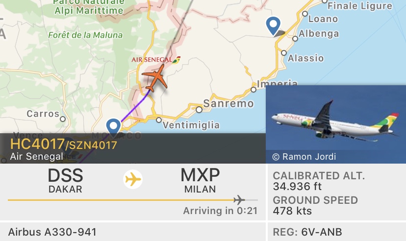 Un A319-111 6V-AMB verso Roma Fiumicino e l’A330-941 6V-ANB in direzione di Milano Malpensa sono sola prima coppia di una serie di tre, per voli di rimpatrio da Dakar operati da Air Sénégal.