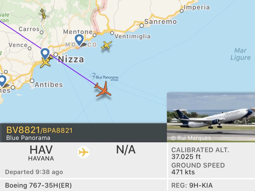 Il B767-35H ER 9H-KIA ha appena lasciato la verticale di Nizza sulla via di Roma Fiumicino. E ‘ in arrivo da Havana. Ieri era partito da Milano Malpensa dove aveva imbarcato il gruppo di medici cubani a suo tempo arrivati in Italia per dare supporto alla sanità italiana con il Covid-19.