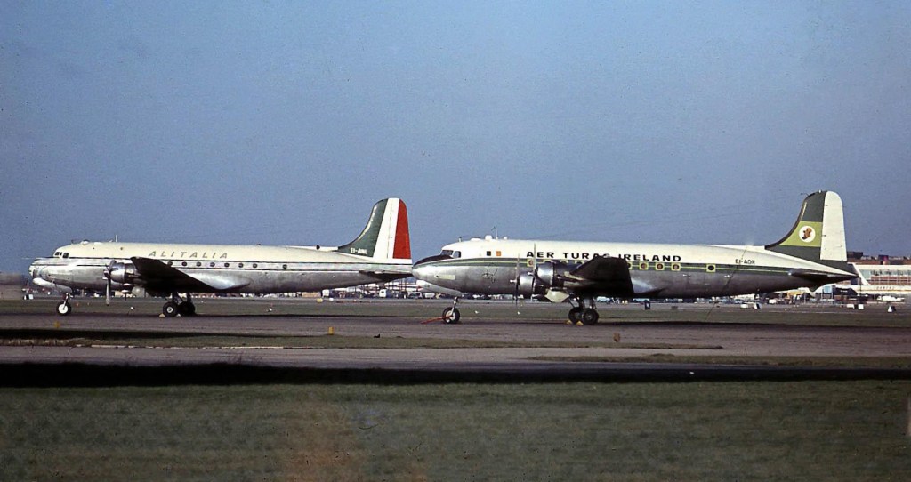 Nella metà degli anni 60, per usi cargo vennero noleggiati 4 DC4 cargo. Tre della tedesca Transportflug e uno dalla Shannon Air poi Aer Turas. Questo esemplare in foto, questa reperita sul web, e’ a fianco di un gemello nella livrea completa del vettore specializzato cargo irlandese.