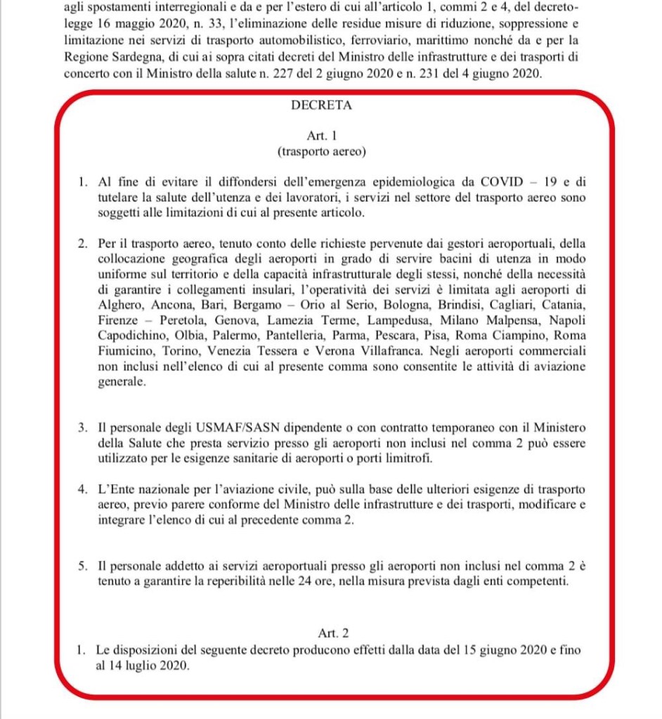 Il Governo ha decretato il prolungamento della chiusura fino al 14 luglio per molti aeroporti italiani in relazione all’emergenza del Covid-19.