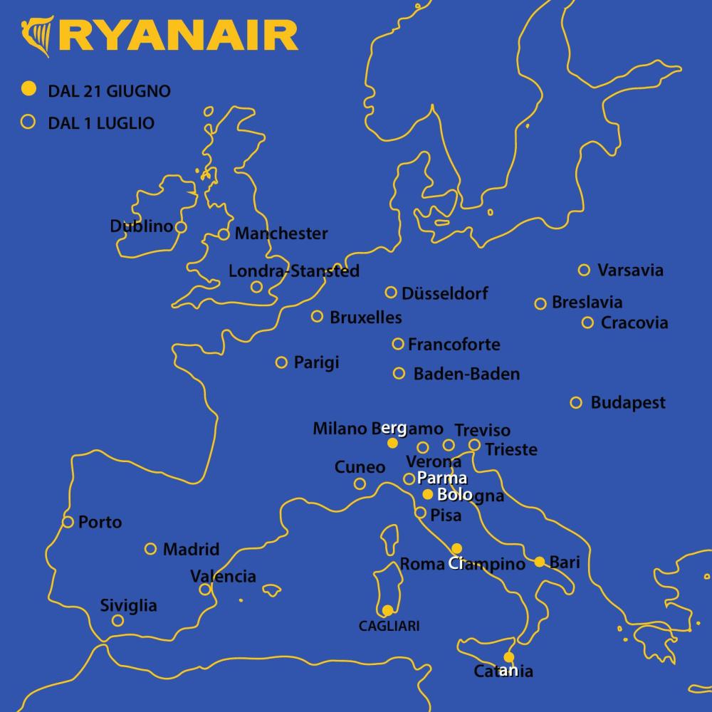 Domenica ripartono i voli con RYANIAR. Ti allego la mappa dei numerosi collegamenti, una foto alcune informazioni: