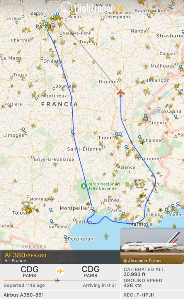 L’A380-800 con Air France sta terminando la sua carriera a breve con il suo atterraggio a Parigi CDG. Il volo AF380 e’ quello ultimo celebrativo della compagnia francese per la dismissione del velivolo. Sta compiendo un volo circolare con partenza e arrivo da Parigi CDG.
