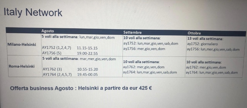 Nel primo mese saranno 10 i voli settimanali, cinque voli settimanali ciascuno su Roma e Milano, optando già da subito per le due ondate. L’intenzione e’ dare seguito alle connessioni sul network degli out da Helsinki.