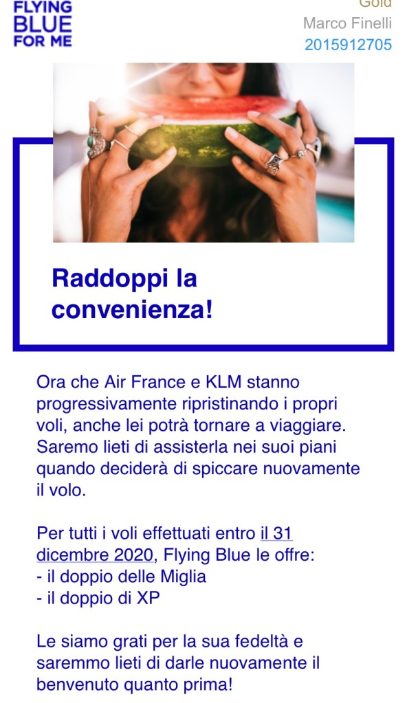 compagnie aeree, rotte Flying Blue raddoppia ai suoi frequent flyer. Pubblicato da Italiavola il 15 luglio 2020 I frequent flyer #AirFrance – #KLM del programma #FlyingBlue avranno il beneficio di vedersi accreditare il #doppio delle #miglia ed il #doppio degli #xP per tutti i voli compiuti entro il 31 dicembre 2020. Condividi: Fai clic per condividere su Facebook (Si apre in una nuova finestra) Facebook Fai clic qui per condividere su LinkedIn (Si apre in una nuova finestra) LinkedIn Fai clic qui per condividere su Reddit (Si apre in una nuova finestra) Reddit Fai clic qui per condividere su Pinterest (Si apre in una nuova finestra) Pinterest Fai clic qui per condividere su Tumblr (Si apre in una nuova finestra) Tumblr Fai clic per condividere su X (Si apre in una nuova finestra) X Mi piace Caricamento... Correlati