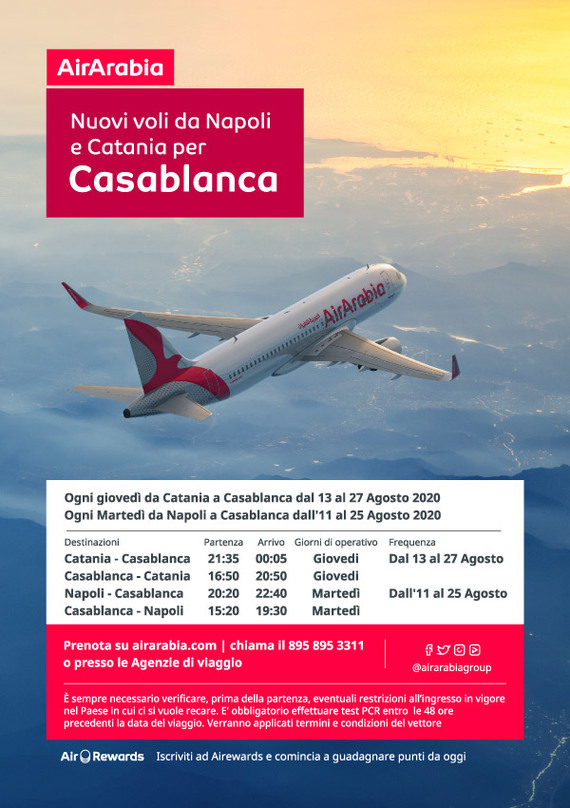 compagnie aeree, rotte Nuovi voli aggiuntivi Air Arabia da Napoli e Catania per Casablanca Pubblicato da Italiavola il 9 agosto 2020 La compagnia Air Arabia ha deciso di aggiungere una frequenza settimanali in agosto da Napoli e Catania per Casablanca. Condividi: Condividi su Facebook (Si apre in una nuova finestra) Facebook Share on LinkedIn (Si apre in una nuova finestra) LinkedIn Condividi su Reddit (Si apre in una nuova finestra) Reddit Share on Pinterest (Si apre in una nuova finestra) Pinterest Condividi su Tumblr (Si apre in una nuova finestra) Tumblr Condividi su X (Si apre in una nuova finestra) X Mi piace Caricamento... Correlati