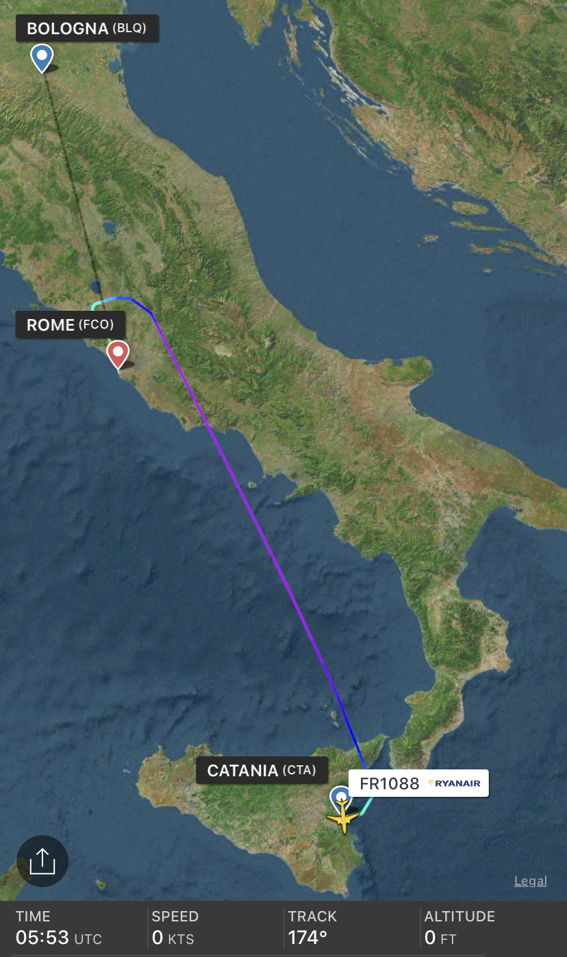 E’ atterrato fuori programma a Roma Fiumicino, il B737-8AS 9H-QAZ della Malta Air/Ryanair. Il volo FR1088 da Catania per Bologna, ha velocemente iniziato la discesa a est di Roma. In 18 minuti dalle 8:51 alle 9:09 ha compiuto la discesa posando le ruote sulla pista 16 sinistra. E’ presumibile che si tratti di un emergenza sanitaria.