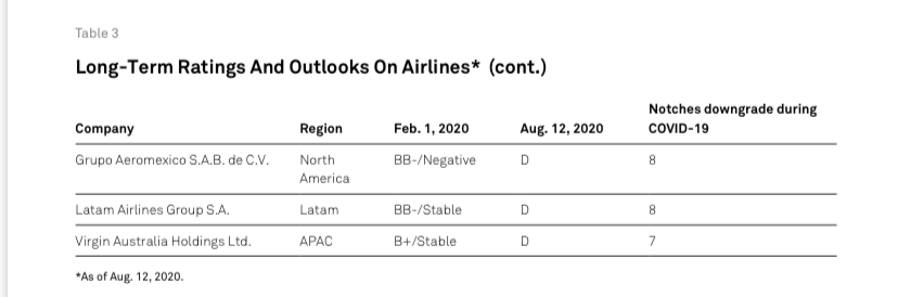 Abbiamo abbassato le nostre valutazioni di più livelli (tra uno e otto livelli; vedi tabella 3) sulla maggior parte delle compagnie aeree dallo scoppio della pandemia COVID-19. Pre-COVID-19 poco più di un terzo del nostro portafoglio di compagnie aeree globali era valutato a “B +” o inferiore, e ora questo è salito a circa due terzi del totale. Solo tre compagnie aeree rimangono investment grade – Ryanair Holdings PLC, Southwest Airlines Co. e easyJet PLC – tutte compagnie aeree a bassissimo costo o a basso costo in gran parte focalizzate sui passeggeri per il tempo libero e sui voli a corto raggio e dotate di una solida liquidità.