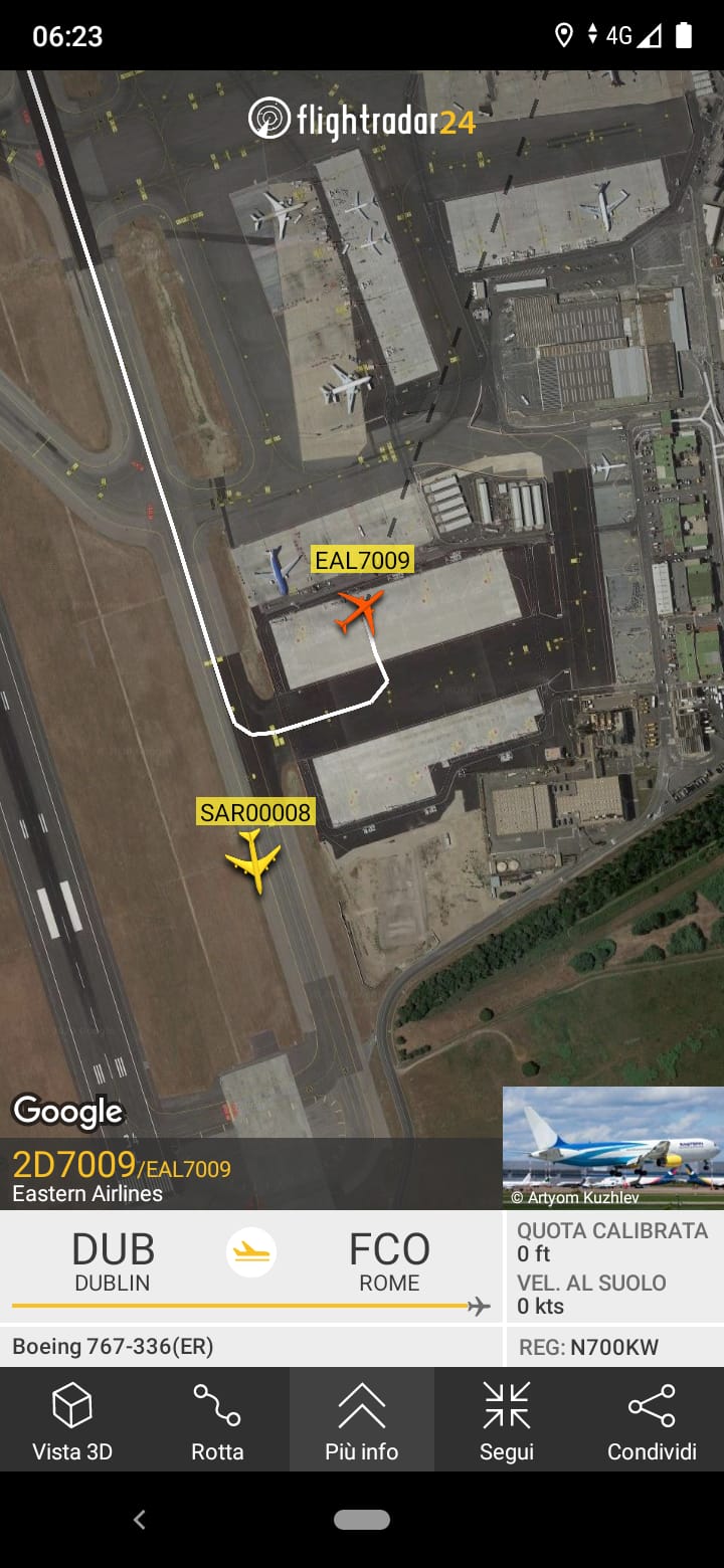 E’ da poco piu’ di un ora l’arrivo a Roma del B767-300ER N700KW della Eastern Airlines. L’aereo e’ giunto da Dublino.