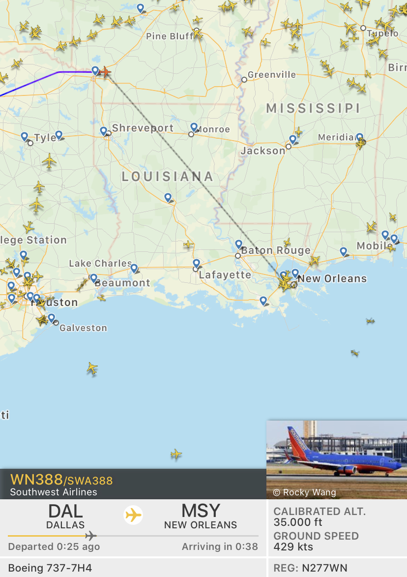 Negli USA la tempesta Laura e’ arrivata alla terra ferma dal Golfo del Messico. Una vasta area di superficie tra Louisiana, Arkansas, Mississippi e una porzione di Texas hanno i cieli sgombri da velivoli. Chi di norma attraversava quelle zone, come il volo Southwest gira al largo.