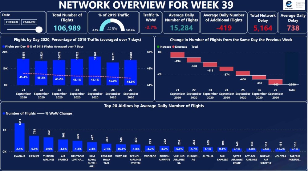 , #Vueling, #Volotea e altre arretrano. I numeri di #Eurocontrol per la 39esima settimana segnano una diminuzione. Intanto la business aviation impera e si sostituisce per molti uomini d’affari ai voli di linea. Il risultato e’ chiaro. Il totale arretra e i voli di linea ancora di più. Aumentano i #voli #cargo, che colmano il gap lasciato da molti voli di linea tuttora inoperativi. Così e’ cambiato il trasporto aereo e queste cifre di Eurocontrol lo testimoniano.